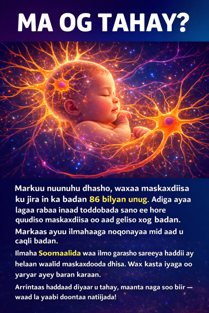 Ilmaha marka uu dhasho, maskaxdiisa waxaa ku jira in ka badan 86 bilyan oo unug. Adiga ayaa lagaa rabaa inaad toddobada sano ee hore quudiso maskaxdiisa oo aad geliso xog badan. Markaas ayuu ilmahaaga noqonayaa mid aad u caqli badan.